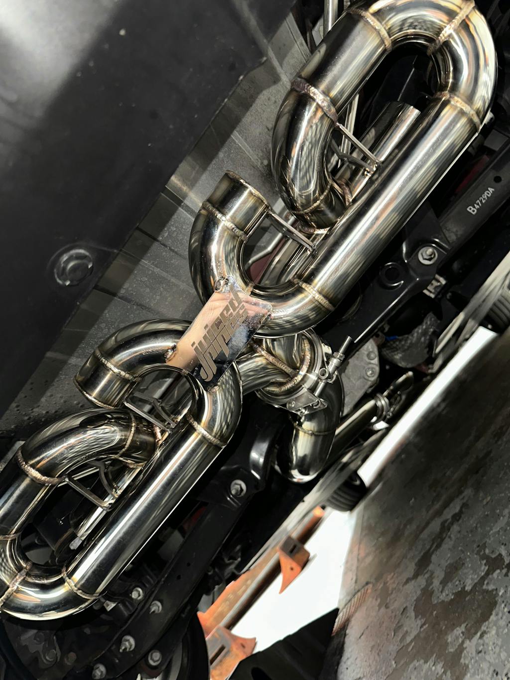 - 3inch center tube to dual 2.5inch, east/west split rear with dual 1.75inch, 360 loop symmetrical rear mounted J-pipes